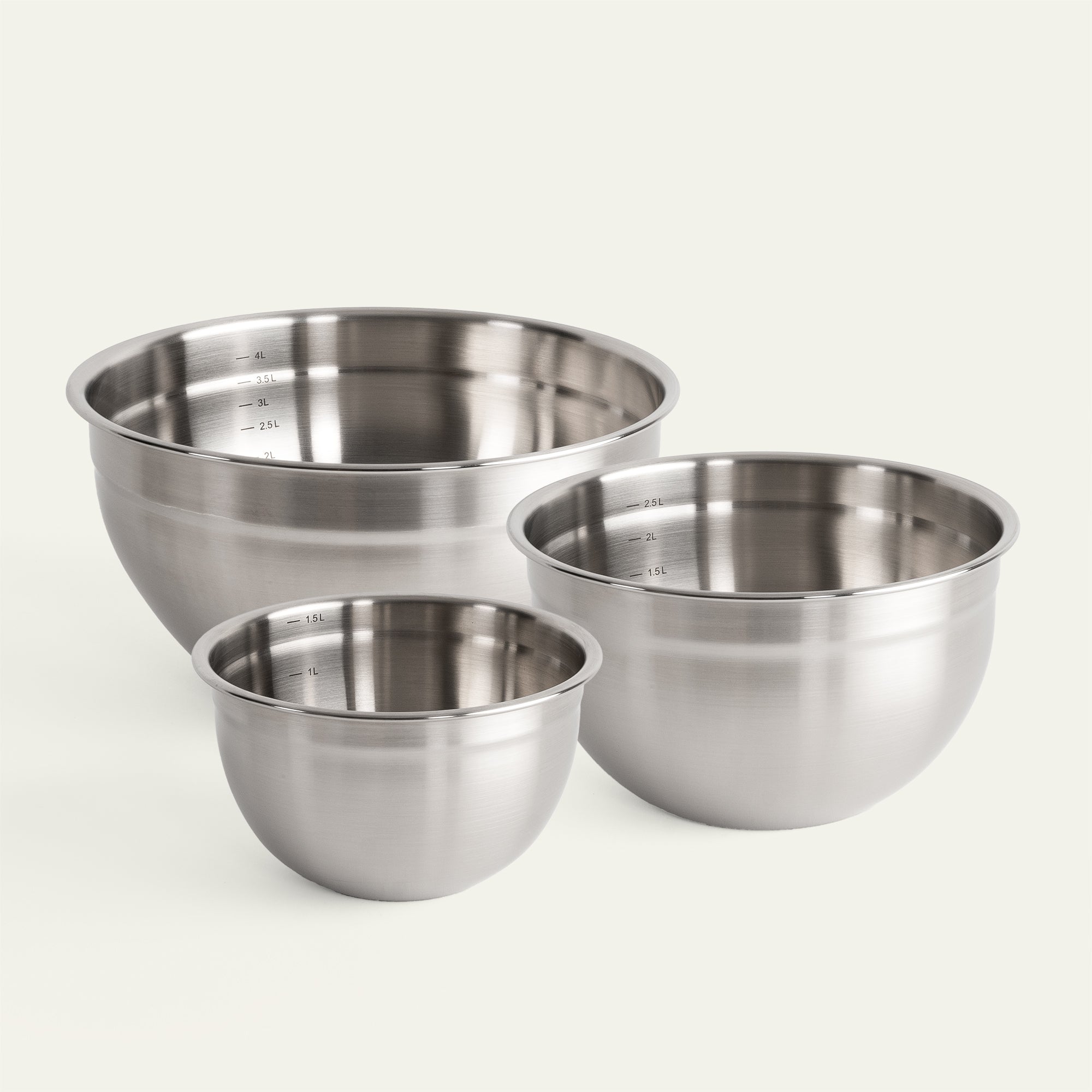 Get mixing bowls in three versatile sizes that last a lifetime. With a timeless stainless steel design, they are made for all kitchen tasks.