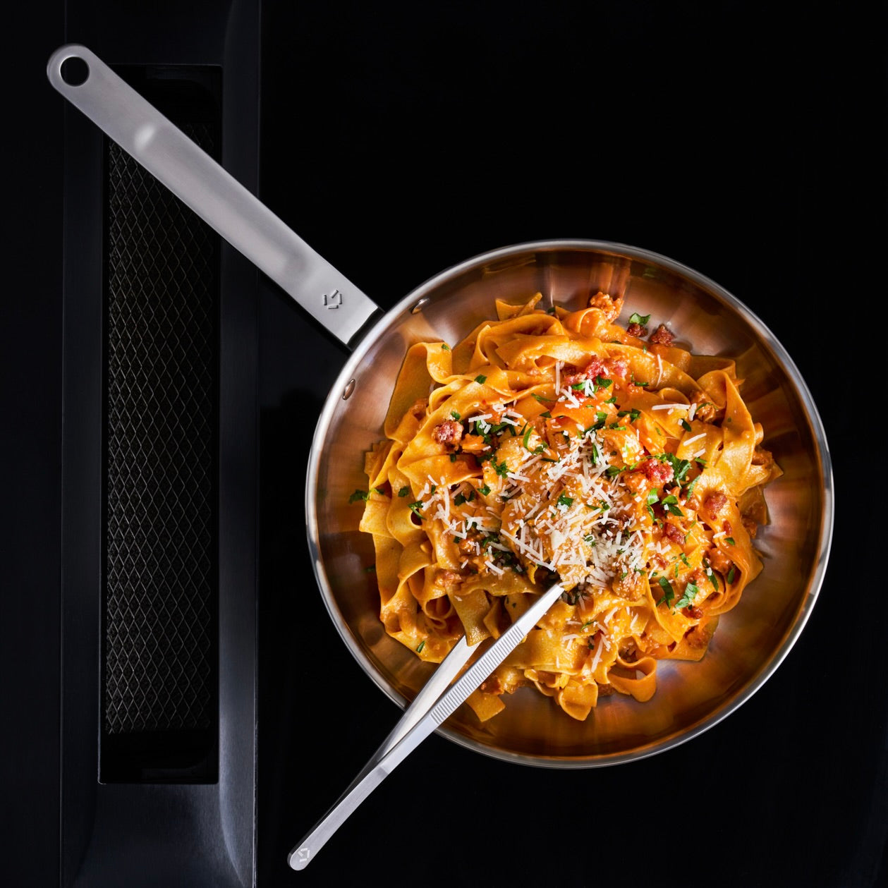 You’ll enjoy precise heat control thanks to its aluminium core, which offers excellent heat conduction and allows you to quickly adjust the temperature. Unlike cookware with an attached sandwich base, the heat naturally spreads up the sides because both the base and walls are made from 5-ply construction – ideal for dishes like risotto and slow-cooked meals.