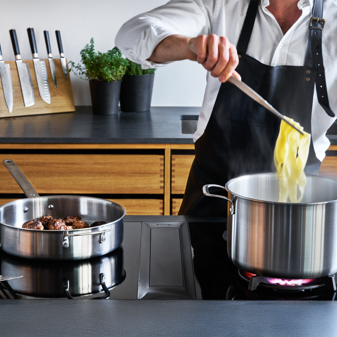 We asked Denmark’s top chefs what the ultimate series of pots and pans should look like, and here it is. Featuring professional details such as a pouring rim, CoolGrip handles, and materials used in the world’s finest restaurants. This 7-piece set includes everything you need. Whether you’re making stock, searing a steak, or whisking a Béarnaise, you’ll have the right tools at hand.