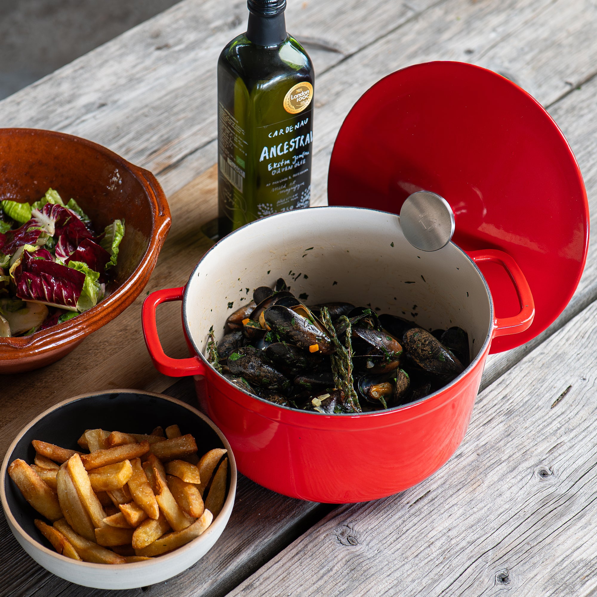 The right cast iron casserole is a once-in-a-lifetime purchase, which is why we have not compromised on production, materials, or design. Our casserole is produced by a French company that has been creating top-quality cast iron products since the 1920s. Here, each casserole is cast in an individual sand mold made from up to 80% recycled materials. The enamel coating is applied by hand by experienced experts to ensure the surface is as strong as possible. It is in the quality of the enamel that the difference between cast iron casseroles is most evident—not tomorrow, but many years from now, when the pot still delivers perfect results, time after time.