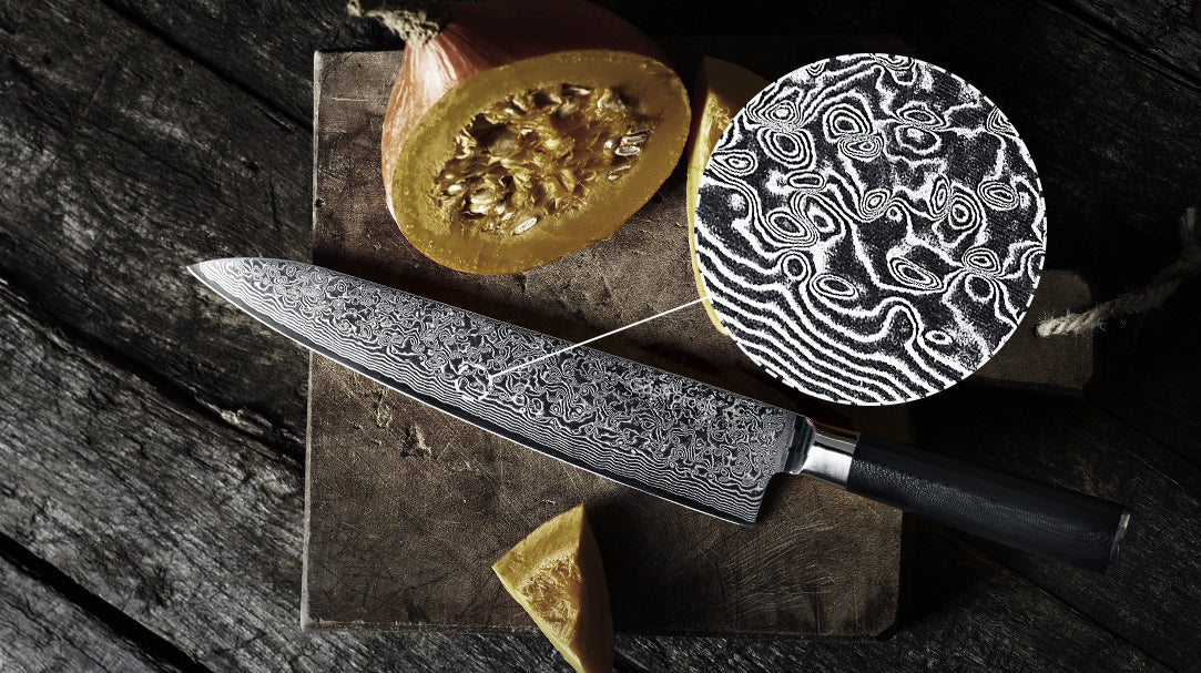 Not only are our kitchen knives a visual delight with their 67 layers of steel creating a breathtaking wave pattern, but each layer also contributes to a strength that protects the core and ensures the knife's integrity. Whether slicing, chopping, or filleting, our kitchen knives express a design balance between art and science.