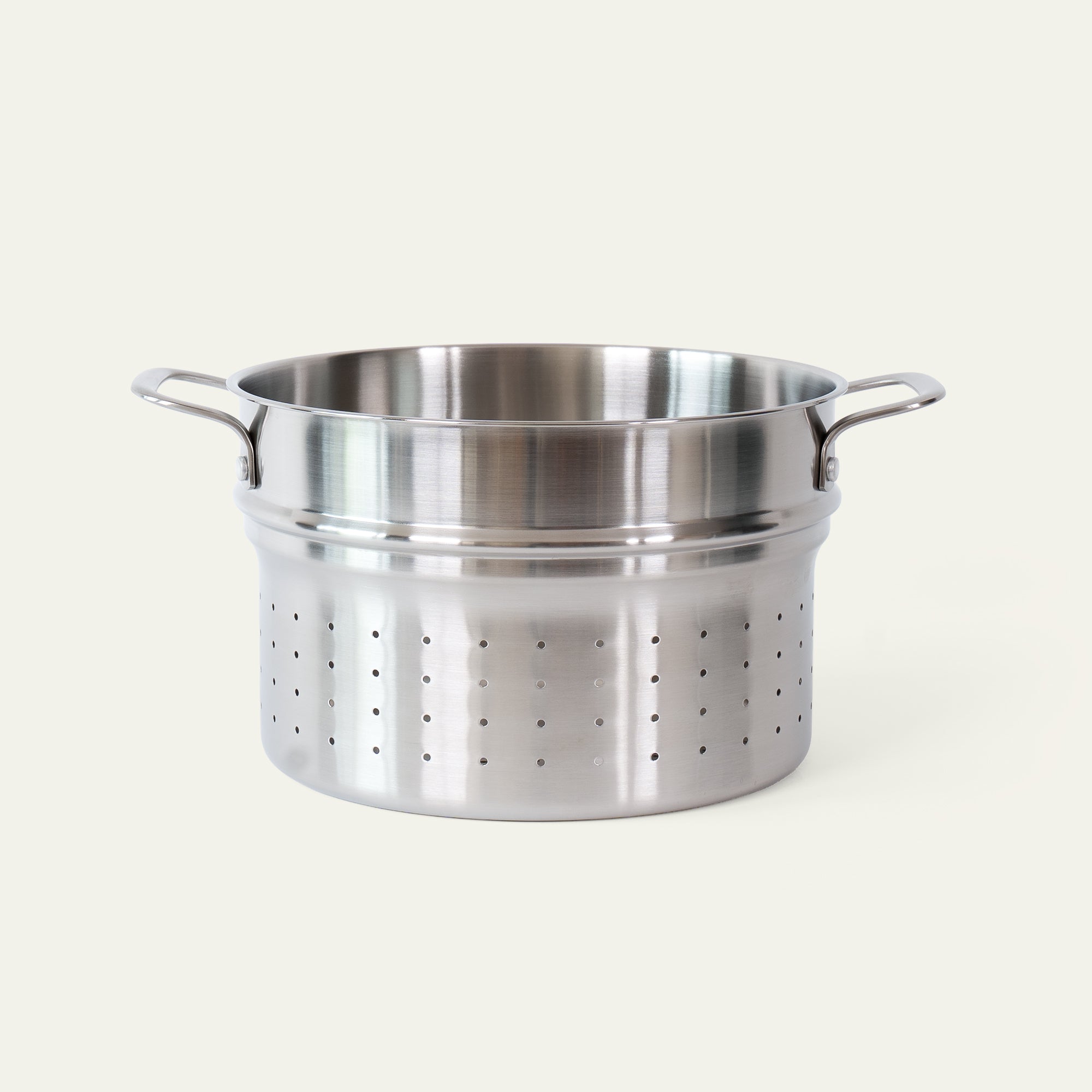 The insert is made in Italy by the same family-owned company that makes our 5-ply cookware. It is designed to fit perfectly in our large 5-ply pot, and the many small holes ensure that the pasta stays where it should. But the insert isn't just for pasta: use it to blanch asparagus, cook potatoes, or boil large quantities of eggs. And with its stainless steel construction, the pasta insert is both durable and easy to maintain.Pasta insert