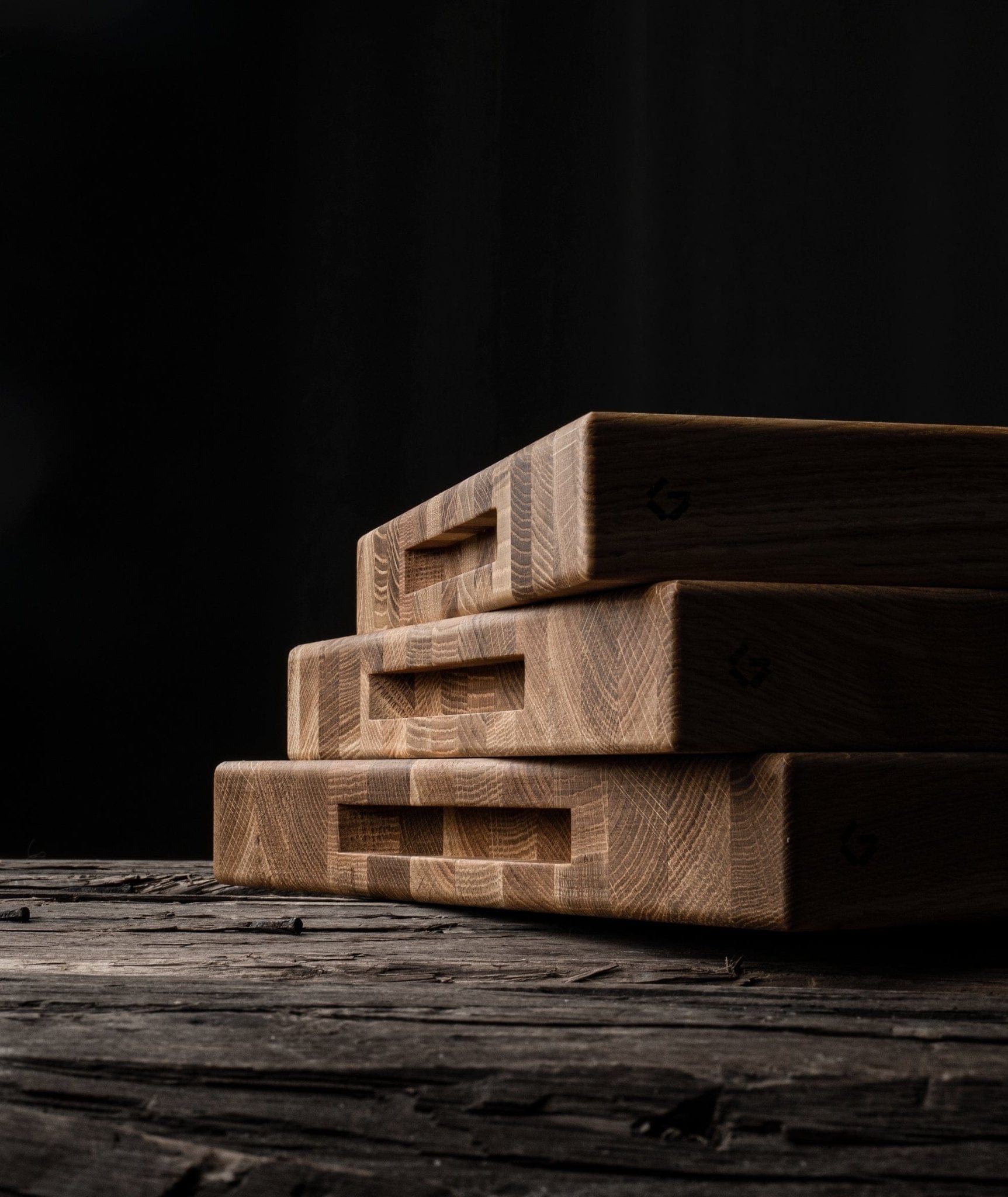 This cutting board is made of solid FSC-certified oak sourced from French forests, where each piece of oak is carefully selected, cut, and glued together. The production takes place in a family business in France with more than 100 years of experience, resulting in craftsmanship of the highest quality.