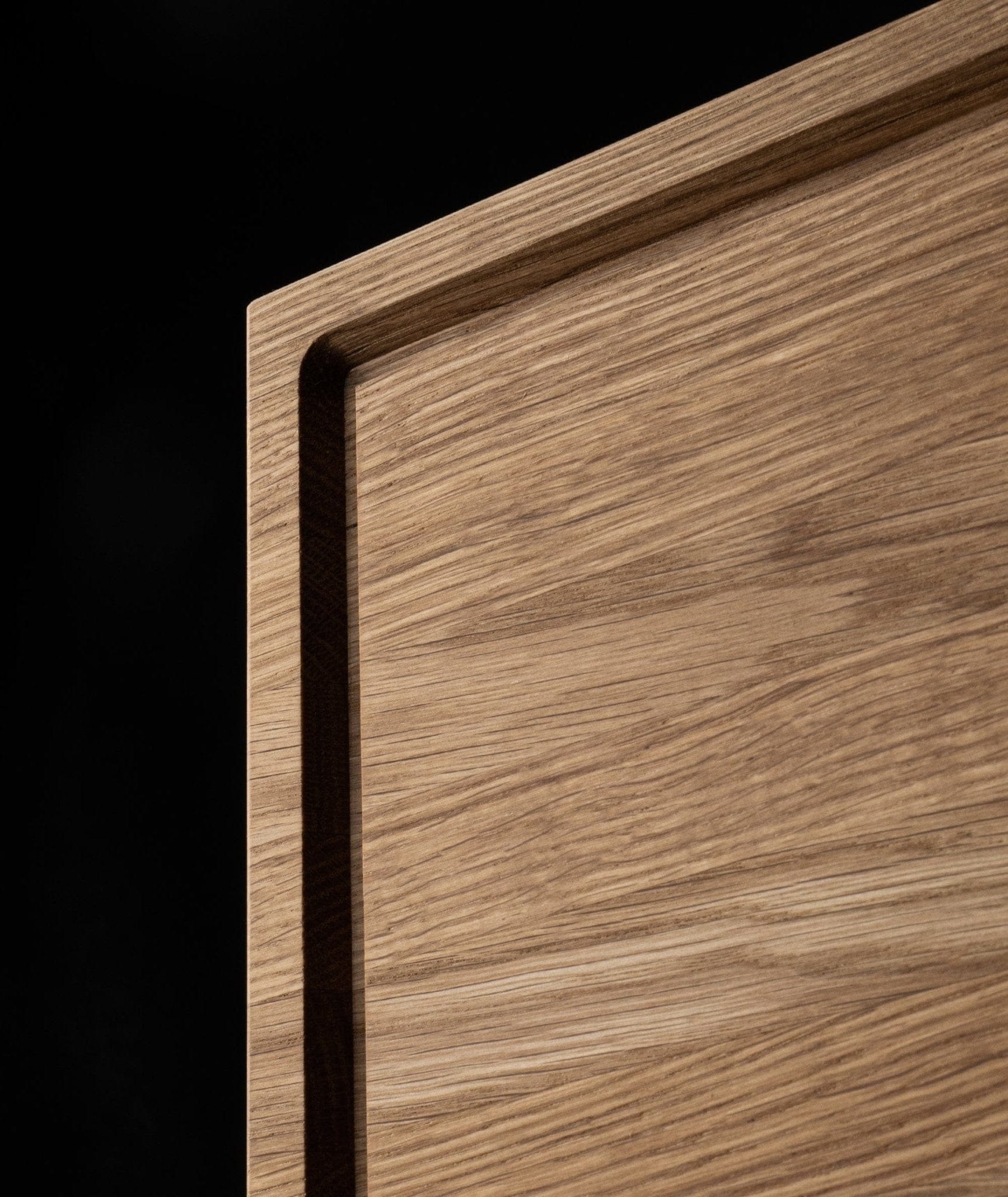 Our cutting board with a juice groove boasts a solid minimalist, timeless design and is bound to become a permanent fixture on your kitchen counter for many years to come. One side is designed to capture juices when you're cutting meat, while the other side is completely flat, making it easy to move chopped vegetables away from the board. The beautiful structure of the solid oak makes this board incredibly suitable as a charcuterie or tapas board.