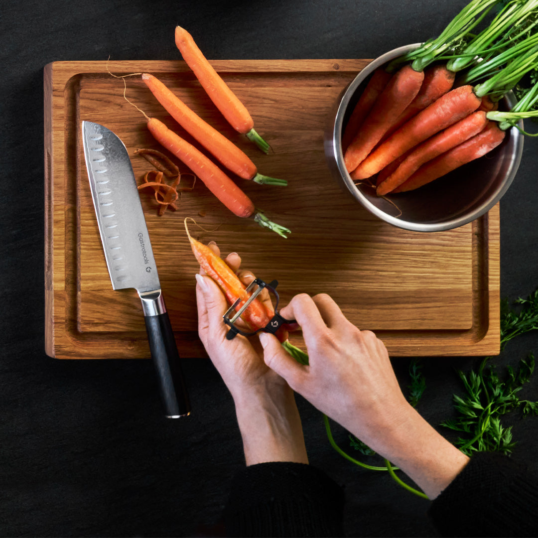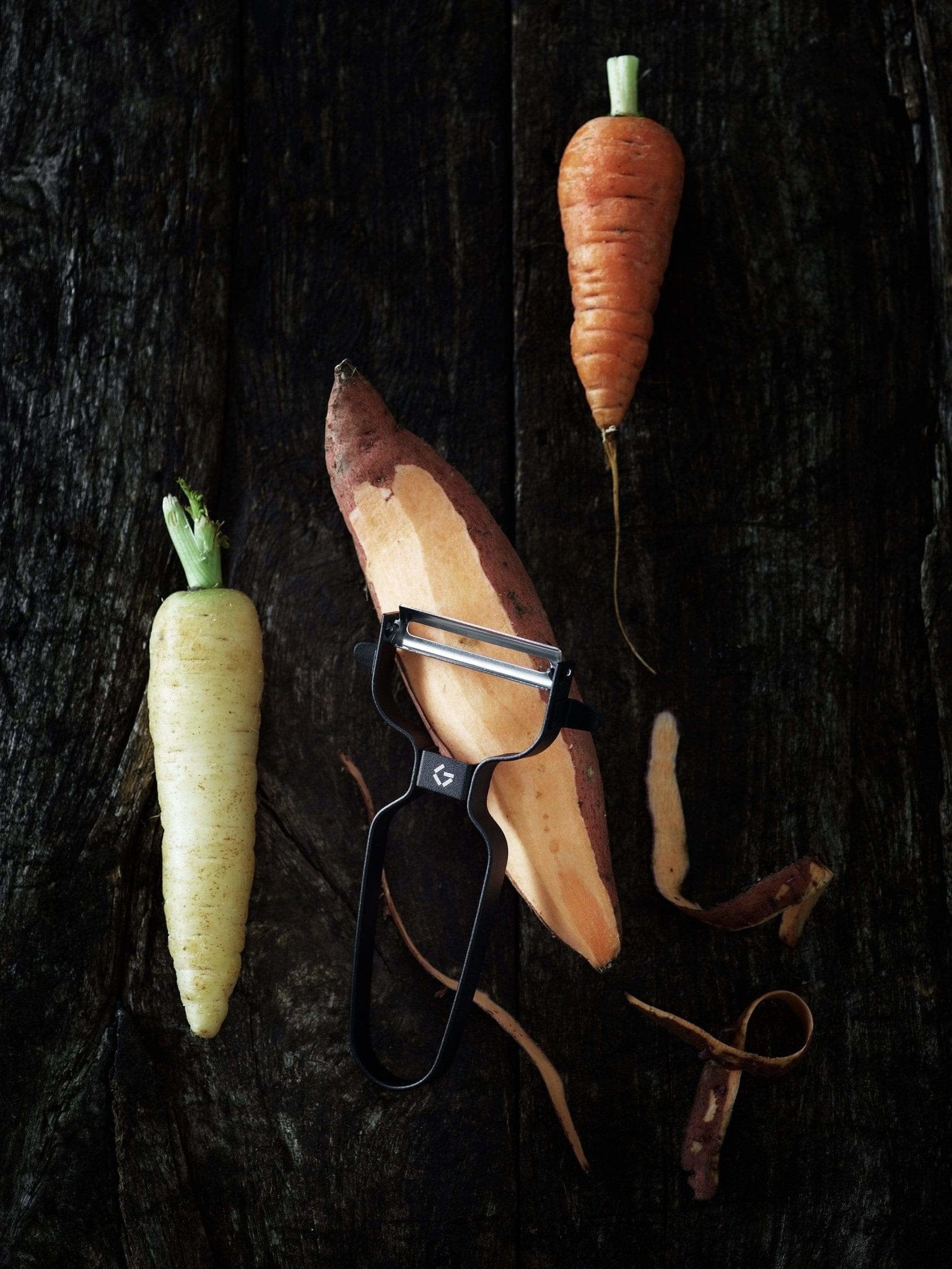 The elegant matte black powder coating provides a minimalist Nordic look and ensures a good grip - even with wet hands. The blade is made of hardened stainless steel, which is ground and polished for maximum sharpness. The pivoting blade makes the peeler advantageous for making thin, flat strips - and is perfect for peeling elongated vegetables such as asparagus, carrots, or salsify. Essential in any kitchen.