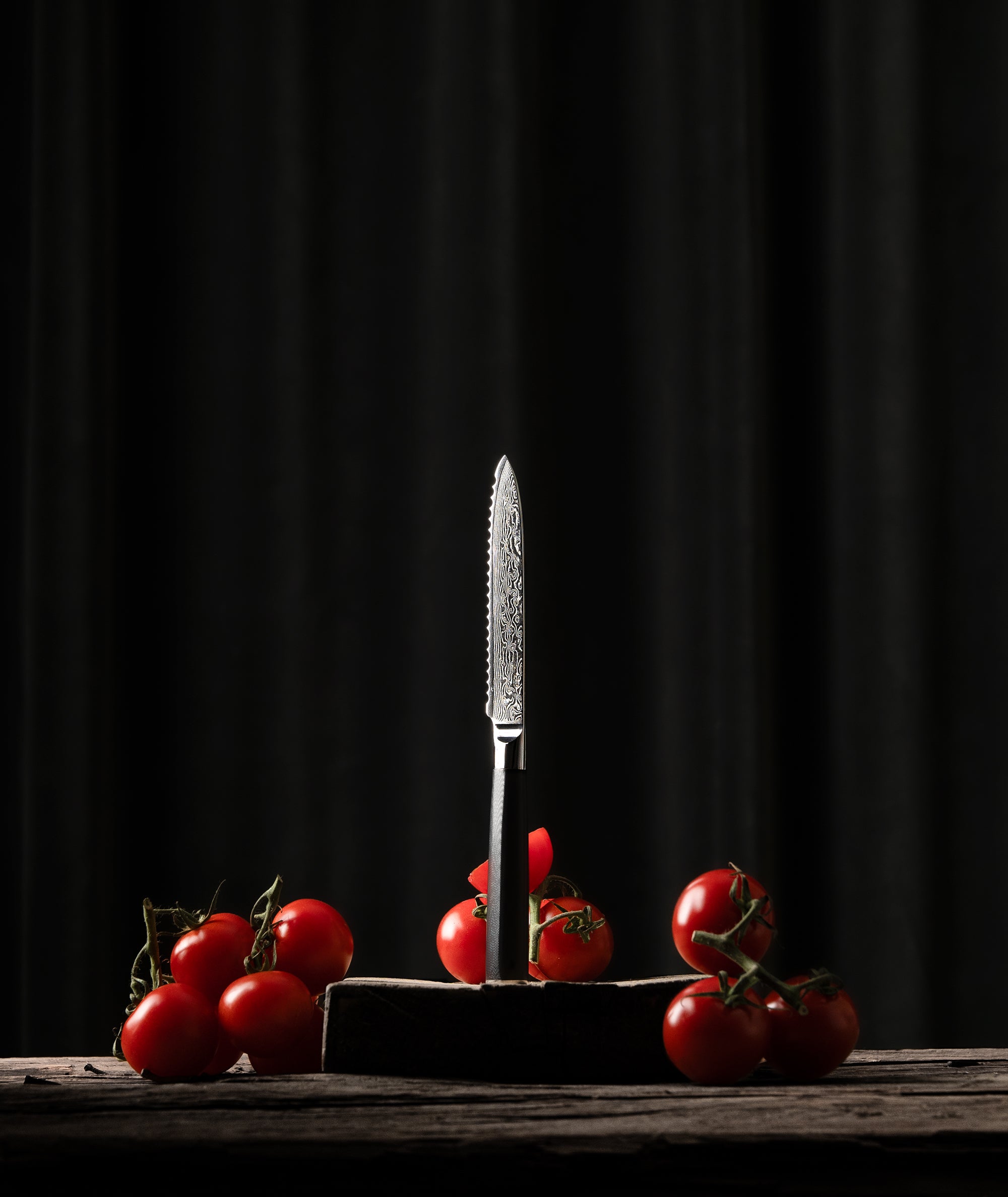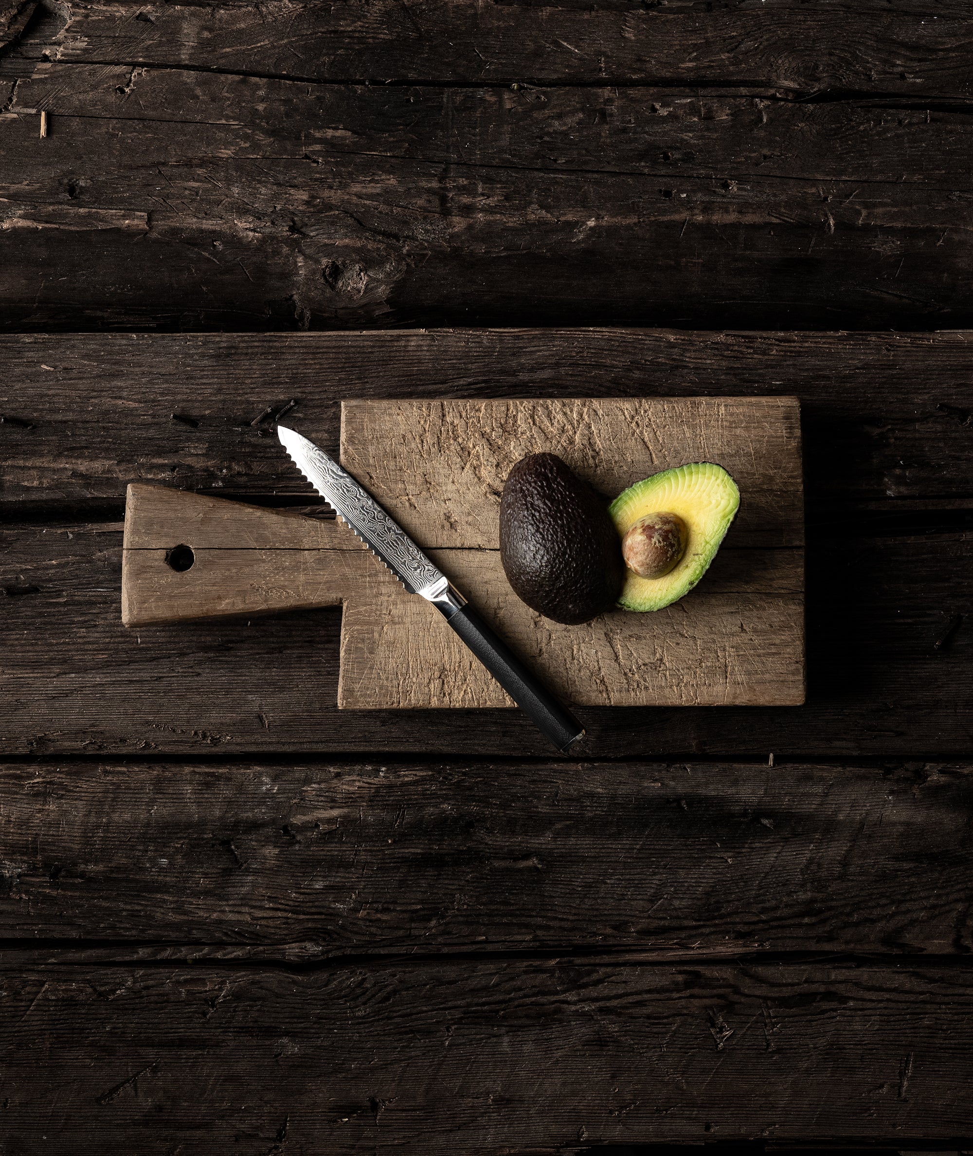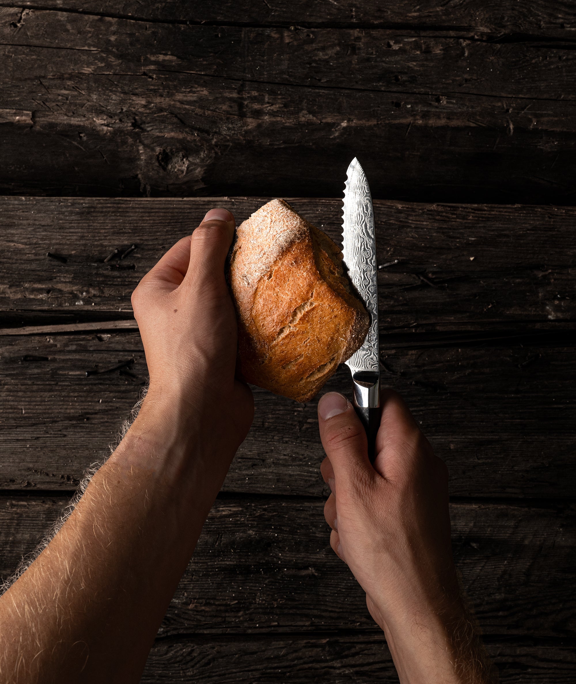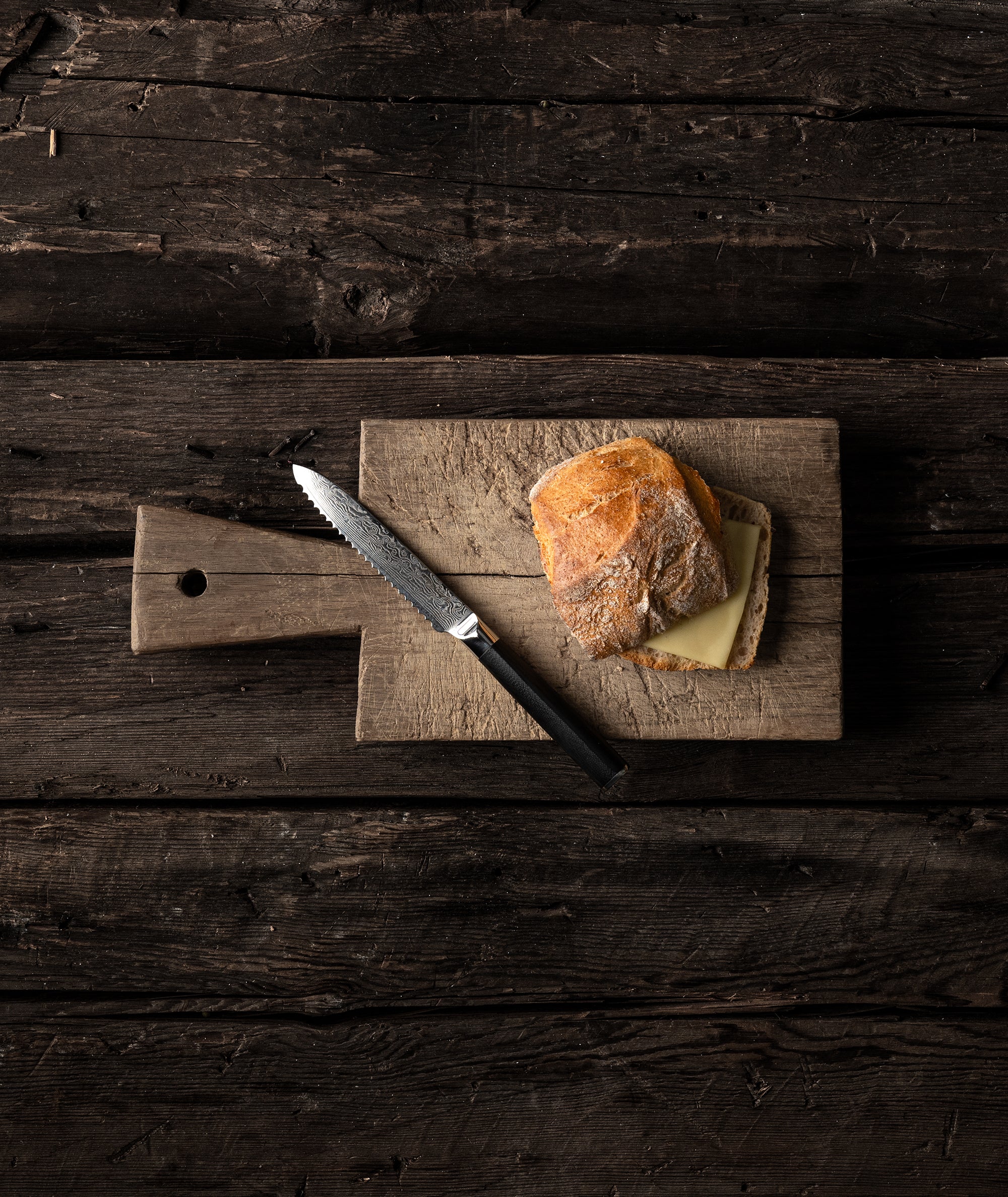 Experience the unmatched versatility of our serrated utility knife. Positioned between a classic chef's knife and a paring knife, it is perfect for a wide range of culinary tasks. Whether slicing juicy tomatoes, hard cheeses, charcuterie or crusty bread, the knife's serrated edge effortlessly cuts through tough exteriors without tearing the delicate insides.
